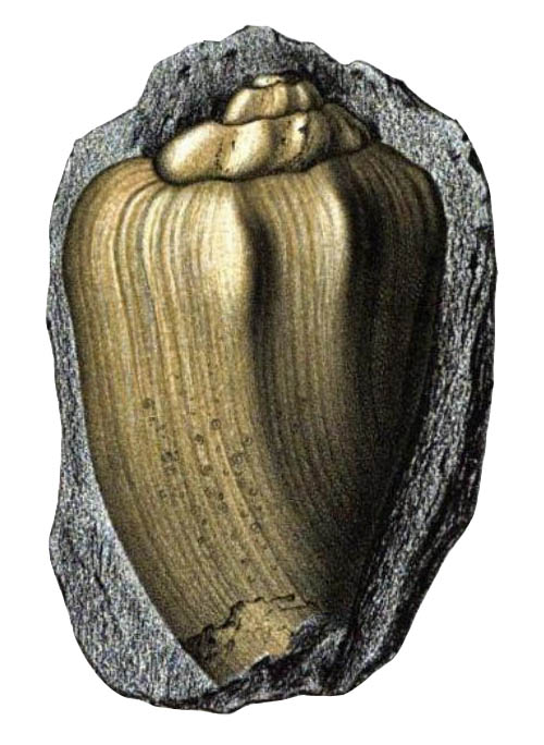 - "Der Steinkern einer ziemlich grossen, ansehnlichen Strombusart scheint einer neuen Art anzugehören. Das Gehäuse ist länglich oval, das Gewinde kurz kegelförmig, die Umgänge mit dicken stumpfen ungefähr um die eigene Breite aus einander gerückten Knoten versehen. Die Oberfläche des Gehäuses scheint vollkommen glatt gewesen zu sein."