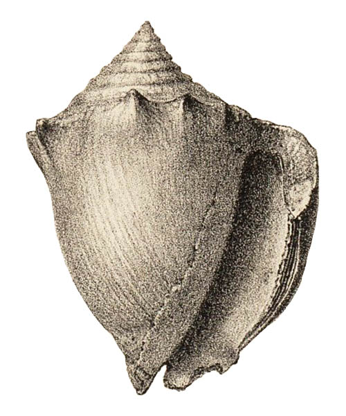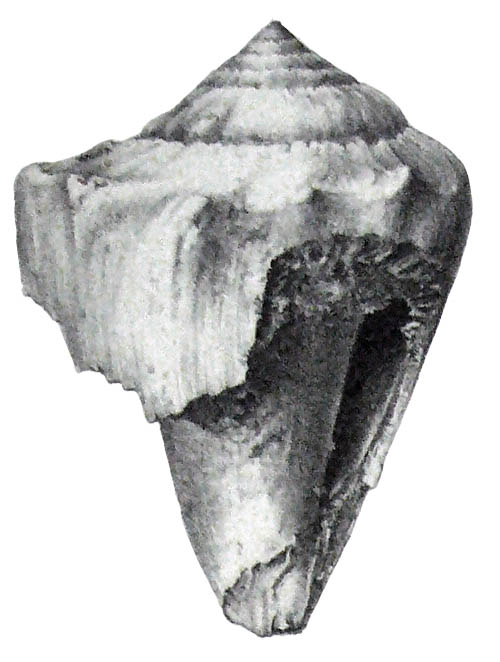 - "Das kegelförmige Gehäuse zeichnet sich durch eine besonders dicke Schale aus. An dem kurzen, flach-conischen Gewinde zählt man sieben, durch einfache, deutliche Nähte getrennte Umgänge, deren Oberfläche in der, für manche Strombus Arten so charakteristischen Weise unregelmässig, buckelig aufgebläht ist. Ausser einer deutlichen, etwas krummlinigen Anwachsstreifung trägt das Gewinde keinerlei Sculpturen. Erst am Schlusse des letzten Umganges beginnen sich kleine spitze Knötchen zu bilden, welche auf die Schlusswindung übergehen und hier nach der Mundöffnung hin beständig an Grösse zunehmen, bis sie auf der rechten Seitenfläche des Gehäuses zu ansehnlichen, spitzen Höckern anwachsen. Diese Querreihe von Höckern scheidt die Schlusswindung in einen hinteren und vorderen Abschnitt, über welche beide hin sich eine deutlich ausgeprägte, S-förmige Anwachsstreifung hinzieht. Der linke Lippenrand ist vollkommen glatt, vom rechten ist leider nichts überliefert.""
