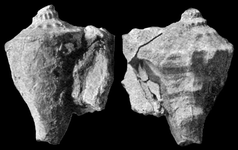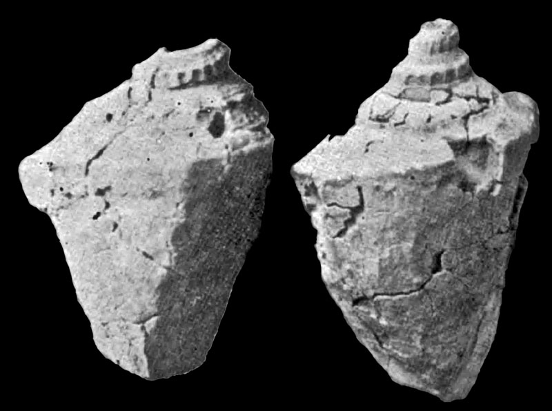 - " Medium-size with extraconic spire equal to one-quarter of the total height, and corrugate-conical body-whorl with widely expanded outer lip. The protoconch, which is missing, is followed by six spire-whorls. The earlier spire-whorls are divided into two sections by a very pronounced angulation. Posteriorly to the angulation there is a broad, feebly sloping, flat or slightly excavate surface, carrying, at rather wide intervals, some very fine, raised, spiral threads. The anterior section of the whorls is vertical or even anteriorly sloping inward and is decorated with numerous, sharp, vertical costae or flutings, with somewhat spinose posterior terminations. They are crossed at intervals by a few inconspicuous, spiral threads. The number of costae on each of the whorls is from eighteen to twenty.This anterior, vertical division of the whorls becomes shorter in each succeeding spire-whorl as, with increasing growth, the suture creeps nearer to the angulation and finally corresponds with it. Consequently the two last spire-whorls and the posterior part of the body-whorl constitute an uninterrupted, gently sloping surface in which there is nothing to indicate the existence of costae save the waviness of the sutures. When the costae finally re-appear on the body-whorl they have assumed the appearance of short, broad spines, much fewer in number than on the spire-whorls. This disposition gives a curiously heteromorphous appearance to the spire which thus consists of a broad, very flatly conical, surface encircled by the few spines of the body-whorl, in the middle of which rises the steep, scalariform and fluted, steeple-like protrusion constituted by the earlier whorls. The large body-whorl, equal to nearly five-sixths of the total height, has a gibbous, elongate-conical base anteriorly terminated by a somewhat twisted rostration. On. the body-whorl the posterior angulation becomes deflected outward and backward to form the expanded angle of the wing-like outer lip. Anteriorly to the angulation and its coarse spines, the base contracts conically, but with a very irregular corrugated outline due to the presence of two swellings with obscure, blunt, broad, boss-like knobs. Feebly raised, wide-spaced, thin, spiral threads cover the base wherever not obscured by the great, callous spread from the columellar lip. The aperture is tall, elongate. The columella is smooth, oblique, feebly convex, anteriorly deflected near its extremity in accordance with the trend of the anterior rostration. The columellar lip is thin, widely spreading, with indistinct border. The incompletely preserved outer lip, carrying posteriorly a wing-shaped expansion, is oblique and probably convex."