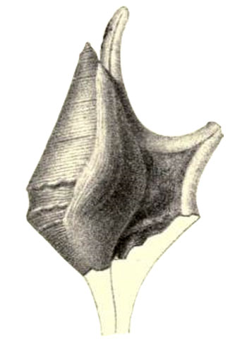 - "Shell up to 44 mm high (apical and rostral digitations incomplete) and 58 mm wide (only posterior outer lip digitation complete). Pleural angle approximately 40 degrees. Protoconch unknown. Teleoconch of at least six whorls (tip missing). Suture moderately impressed. Immature shell: Turriculate, consisting of five whorls, unicarinate; numerous spiral threads on whorls, threads more widely spaced on ramp. Penultimate whorl carina with weak nodes. Mature shell: Consisting of very wide last whorl, strongly bicarinate, carinae with many small nodes, posterior carina stronger, interspace covered with spiral ribs. Aperture wide. Outer lip thickened with callus, expanded into four slender canaliculate digitations. Apical digitation extending along spire at angle to shell axis and crossing below tip of shell. Posterior and anterior outer lip digitations extending from their respective carinae. Rostral digitation apparently straight. Callus deposit over ventral face of shell becoming massively thick on ablabral edge, forming thick ridge that crosses carinae and continuing up spire along edge of apical digitation; tip of spire free of callus, but tipmissing from specimens withmost callus. Base of last whorl free of callus, flattish, with spiral threads immediately anterior to anterior carina. Apertural side of neck with some light callus glaze."
