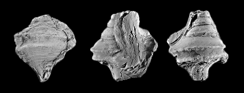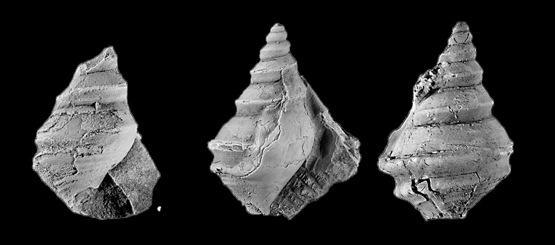 Tessarolax gabbi Saul & Squires, 2015; Budden Canyon Formation, Ogo Member, upper Hauterivian, Cretaceous; North Fork Cottonwood Creek area, Ono, Shasta County, California; left hypotype LACMIP 13568, middle and right hypotype LACMIP 13569