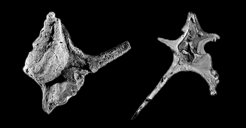 Tessarolax gabbi Saul & Squires, 2015; Budden Canyon Formation, Ogo Member, upper Hauterivian, Cretaceous; North Fork Cottonwood Creek area, Ono, Shasta County, California; left hypotype LACMIP 13570 , right hypotype CAS 62534.01