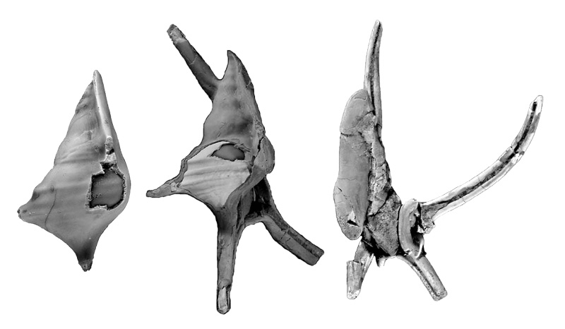 - "Shell fragile and thin, up to 88 mm high and 56 mm wide (essentially complete). Pleural angle approximately 37 degrees. Protoconch covered by callus deposit. Teleoconch of six whorls. Suture callused over. Immature shell: Essentially unknown due to callus coverage. Mature shell: Consisting of last whorl, tricarinate, carinae (not noded) equally spaced and nearly of equal strength. Base of last whorl with several weak and moderately widely spaced spiral ribs, decreasing in strength anteriorly. Entire last whorl covered with numerous microscopic and very closely spaced spiral threads between carinae and prominent spiral rib. Aperture moderately narrow. Outer lip extended into four narrow canaliculate digitations. Apical digitation curved, extending along spire but diverting from tip of shell. Posterior and anterior outer lip digitations long, strongly curved, and extending from their respective carinae. Posterior outer lip digitation bending posteriorly. Anterior outer lip digitation extending forward to callus knob, then bending away from substrate. Rostral digitation nearly straight or curved into wide U-shape. Dorsal spine, long and slender, prominently emanating from at or near anterior carina on middle of dorsal side of last whorl and commonly bent. Callus covering shell obscuring two carinae on last whorl and hiding ornamentation. Callus on venter can accentuate convexity (plumpness) of last whorl. Ablabral callus elongate, narrow, extending over apex in small curl, and merging with ventral callus to form long and blade-shaped fictavarix. Growth line opisthocline."