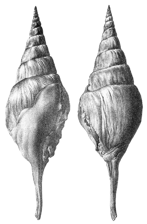 - "R. testa valida, ponderosa, conico-fusiformi, apice subulata, 13-14 anfractibus, primis convexis, longitudinaliter plicatis, coeteris planiusculis, veluti in semetipsos intromissis; in sutura canaliculatis; ultimo ventricoso ad basim sulcato, in rostrum rectum, gracile, perlongum terminato; apertura ovato-oblonga; labio per callum validum incrassato; labro extus marginato, tri vel quadridentato, superne canali spiriformi usque ad penultimum vel antepenultimum anfractum protracto."