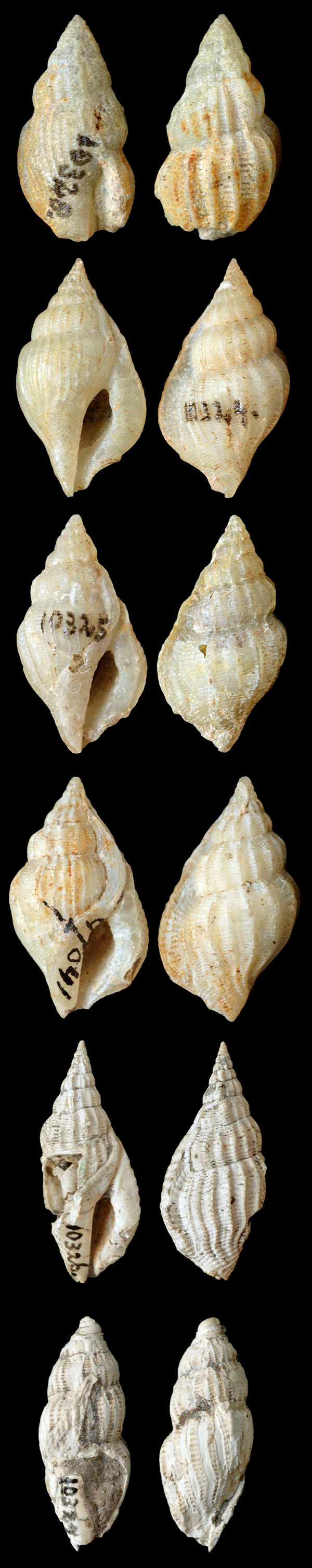 Rimella mordax (Martin, 1916); Syntypes; West Progo Beds, lower Miocene; Kembang Sokkoh, Java Island, Indonesia; in Leloux & Wesselingh, 2009; Coll. Naturalis Leiden nos. RGM 10328, 10324, 10325a, 47041a, 10326 and 10327a; Copyright Naturalis