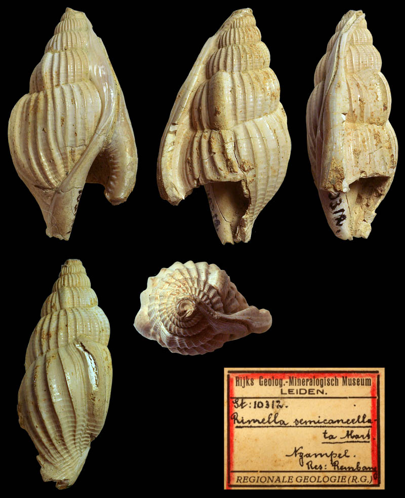 Rimella semicancellata (Martin, 1899); Holotype; Rembang Beds, lower Miocene; near Sedan, Java Island, Indonesia; in Leloux & Wesselingh, 2009; Coll. Naturalis Leiden no. RGM 10310; Copyright Naturalis, [pl. 231, figs 2 and 3].(Leloux & Wesselingh, 2009)