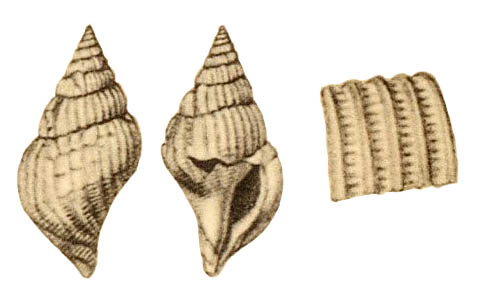 - "Eine spindelförmige Schale, von dessen Embryonalende nur reichlich ein einziger Umgang erhalten ist. Sein jüngster Abschnitt zeigt einige sehr schräg zur Achse des Gehäuses gestellte Querrippen und ist hierdurch von der ältesten Mittelwindung zu scheiden, da auf dieser die Querskulptur in der Richtung der Schalenachse verläuft. Die Anzahl der Mittelwindungen beträgt sieben; sie sind schwach gewölbt, sämmtlich mit scharf ausgeprägten Querrippen bedeckt; aber den vier ältesten fehlt jede Spiralskulptur. Dagegen ist letztere auf den drei jüngsten Mittelwindungen sehr wohl ausgeprägt; sie besteht aus Längsfurchen, welche namentlich in den Zwischenräumen der Rippen deutlich hervortreten und am jüngsten Abschnitte des Gewindes überhaupt ganz auf diese beschränkt bleiben, ohne die Rippen selbst zu kreuzen. An der Schluuswindung reichen letztere bis zu dem stark verschmälerten Stirnabschnitte; dagegen treten die Spiralen auf ihr sehr zurück; sie sind hier nur vorne scharf ausgeprägt, auf der Mitte der Rückenfläche ganz geschwunden und auch weiter rückwärts, an der Sutur, nur kaum bemerkbar. Eine Anzahl alter Lippenwülste ist ohne Gesetzmässigkeit über das ganze Gehäuse vertheilt. Leider fehlt der jüngste Theil der Schlusswindung, so dass sich über Mündung nichts aussagen lässt. Die Länge der Schale beträgt reichlich 21 mm."