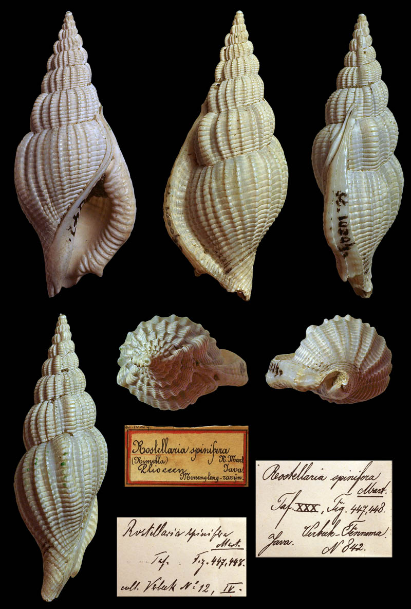 Locus typicus: Menengteng Gorge, Waled, Ceribon, Java Island, Indonesia Stratum typicum: Pliocene ![]() Dientomochilus cancellatus spiniferus (Martin, 1899); Syntypes; Pliocene; Menengteng Gorge, Waled, Ceribon, Java Island, Indonesia; in Leloux & Wesselingh, 2009; Coll. Naturalis no. RGM 10304 a, b; Copyright Naturalis ![]() Rostellaria spinifera (Martin, 1899); Syntype; 27mm; Pliocene; Menengteng Gorge, Waled, Ceribon, Java Island, Indonesia; Coll. Naturalis no. RGM 10304 a; Copyright Naturalis ![]() Rimella cancellata spinifera (Martin, 1899); Pliocene; Java Island, Indonesia; Coll. Naturalis ![]() Rimella cancellata spinifera (Martin, 1899); Pliocene; Java Island, Indonesia; Coll. Naturalis no. ST.46426; Copyright Naturalis